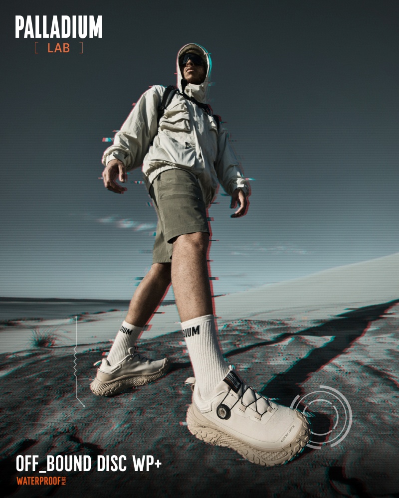 PALLADIUM[LAB]實驗計畫以「FUNCTION MAKE IT FASHION」為設計核心,展現品牌對未來機能與戶外科技的極致實踐,透過不斷進化、超越界限,推出首款旋鈕快速鞋帶系統的OFF_BOUND DISC WP+防水波浪鞋,宣示定義機能潮流的企圖,邀請城市探索者跨越界限,讓機能成為驅動風格的關鍵動能,本次形象照以無垠荒野與沙漠邊界為場景,藉由遼闊地景與鞋款俐落線條的對比,勾勒出極具張力的URBAN OUTDOOR探險視覺語彙,科技風格結合大地色調,在廣袤無垠的沙漠中,完美詮釋了無畏邊界、主宰場域的機能美學。