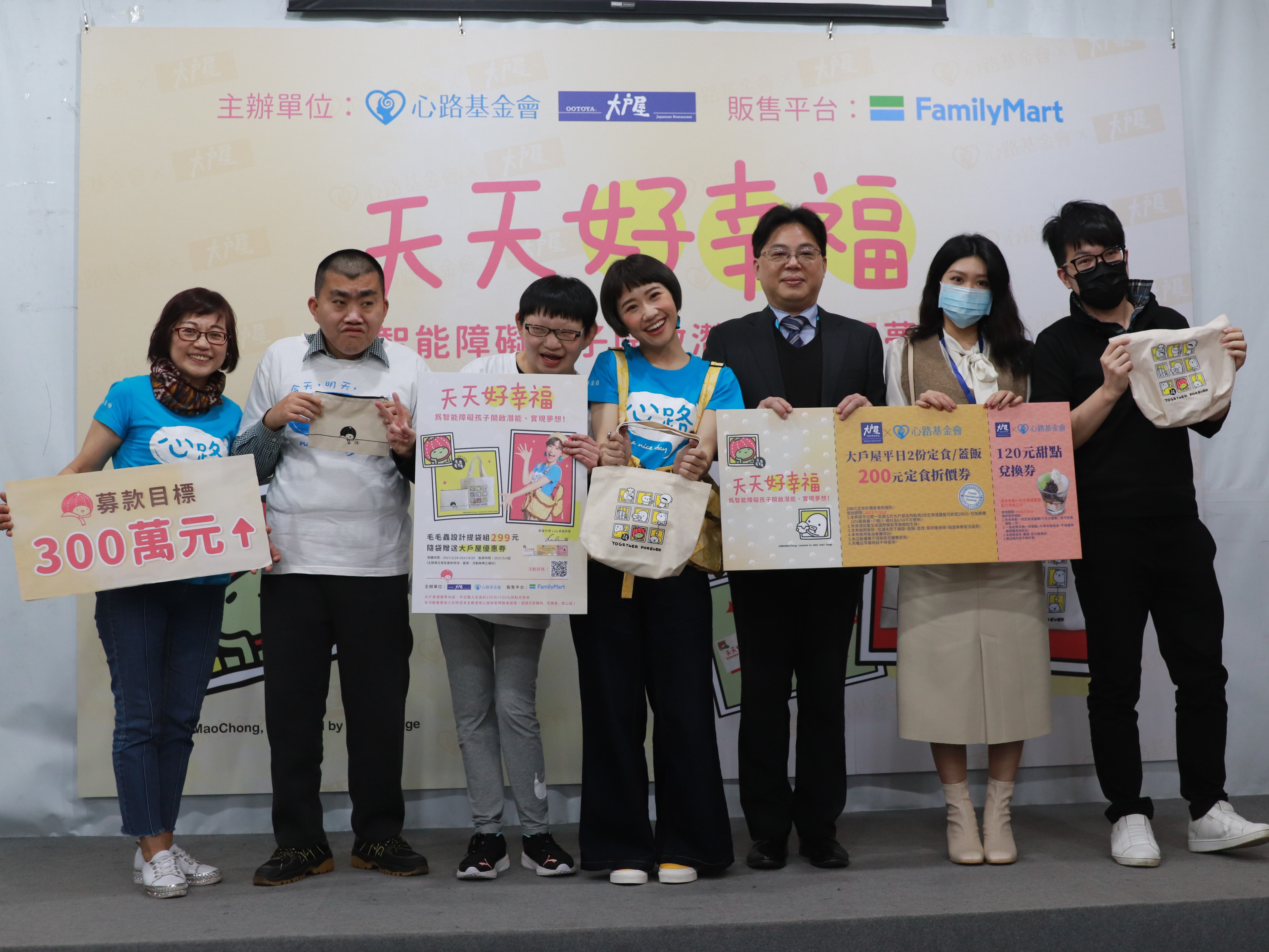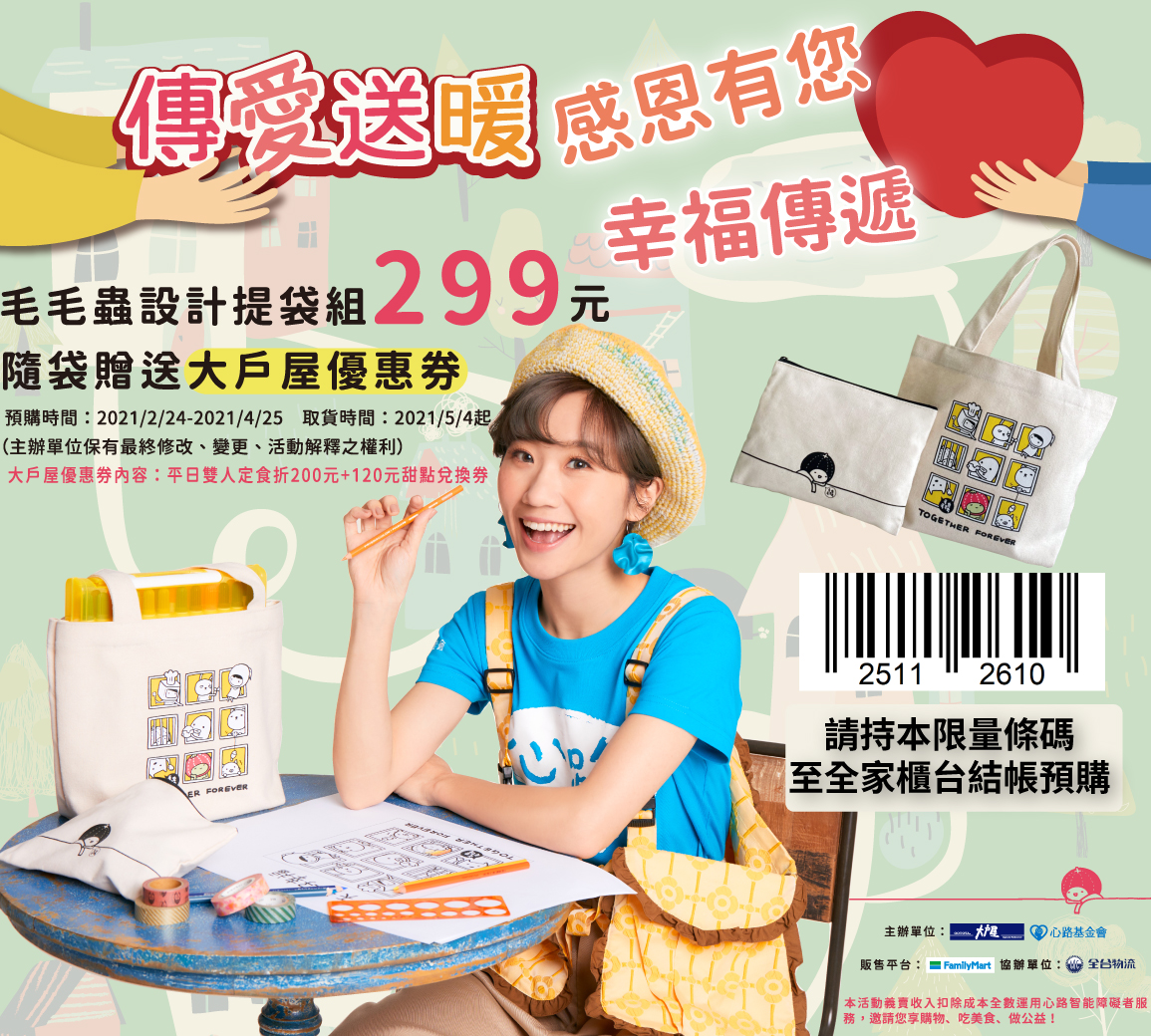 本次推出「天天好幸福」公益商品「幸福提袋組」,由知名插畫家毛毛蟲設計、Lulu黃路梓茵 幸福推薦,讓你購物同時做公益,還能獲得超值「大戶屋優惠券」,義賣所得扣除成本全數運用於心路心智障礙全方位服務。