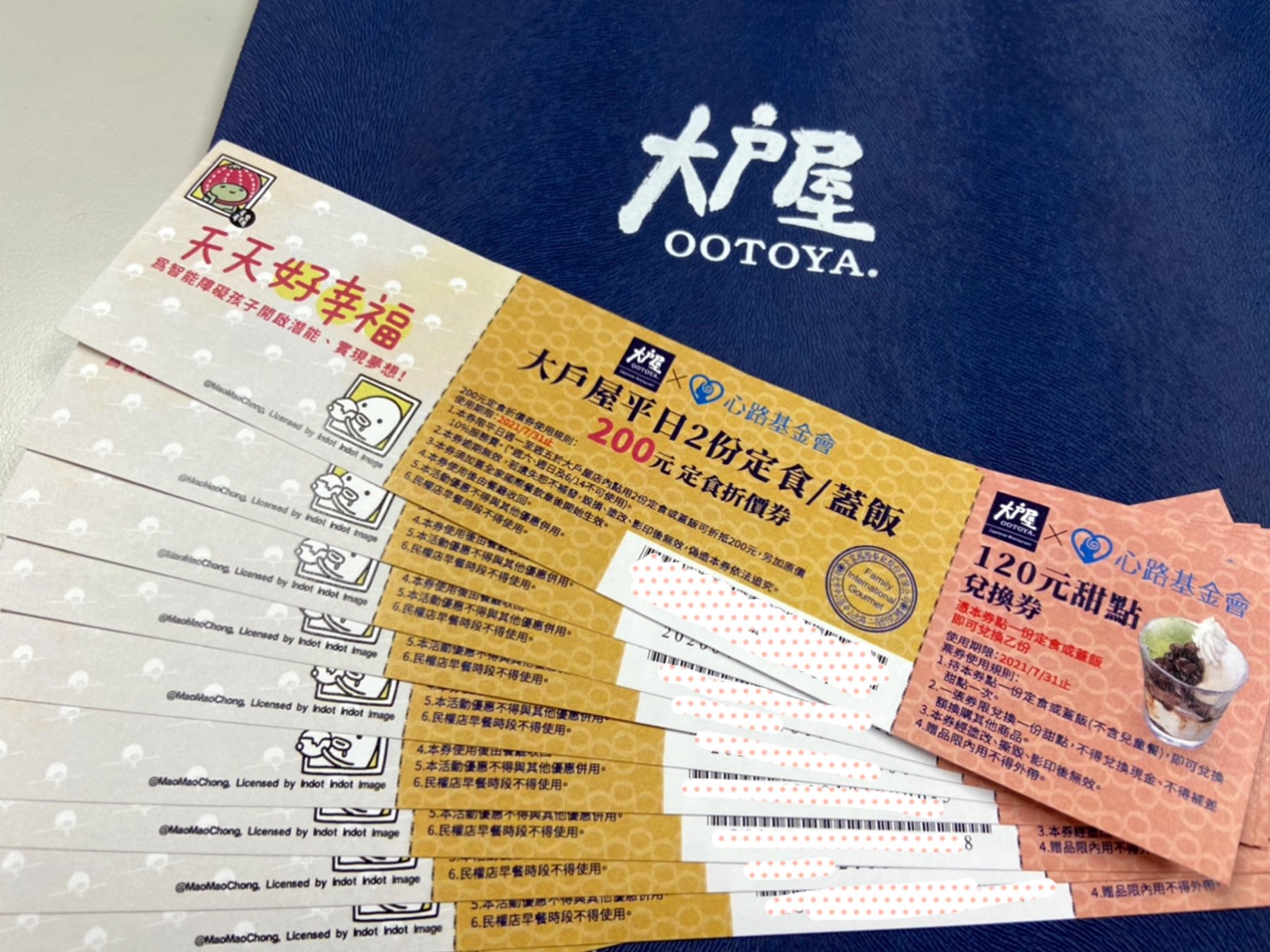 即日起,可至全家便利商店FamiPort預購每組售價299元「心路x大戶屋 天天好幸福提袋組」,隨袋附贈「大戶屋優惠券」(平日2份定食/蓋飯200元折價券+120元甜點兌換券),義賣所得扣除成本全數運用心路心智障礙服務經費。