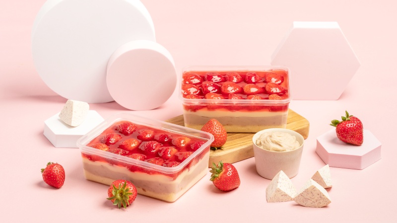 草莓芋泥盒以黃金牛奶蛋糕為基底,堆疊上超厚實芋泥及濃郁卡士達,再以一顆顆的完整草莓滿版排列,最後淋上手工鮮莓果醬,大口品味幸福滿點,嘴裡就像是音樂盒般在為你獻上一曲甜蜜蜜的四重奏呢~