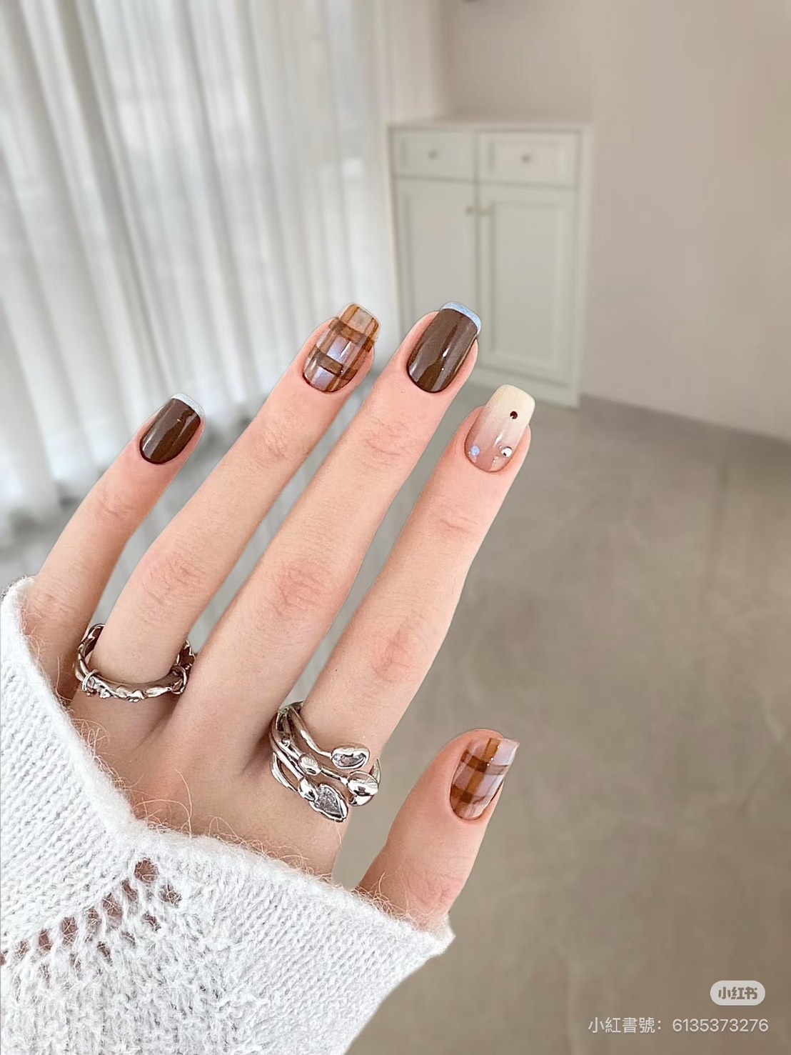 棕色給了我們安定的力量,藍色給了我們遠行的勇氣,人生不該只有一種顏色,它需要棕的厚度,也需要藍的深度,當我們能在繁忙的現實中保持沉著,又能在平凡的日常裡懷抱夢想,那便是最成熟的生活狀態,學會在棕色中腳踏實地,在藍色中仰望星空,讓人生既有溫度,也有思考,換上「藍棕格紋指彩」最終,我們都會在這兩種顏色的交錯中,找到屬於自己的光——不耀眼,卻深遠。
