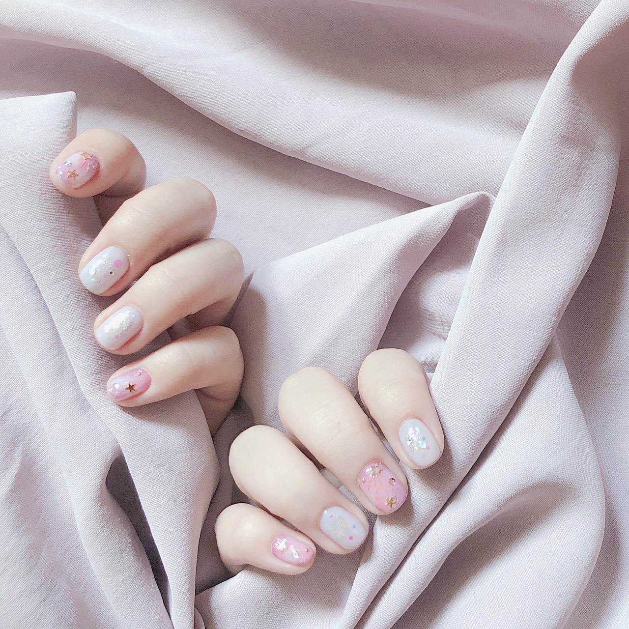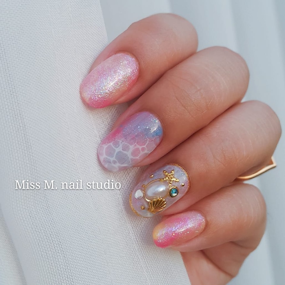 ▼粉紫搭配帶有一點螢光感的粉色調,暈染下添加星星、亮片、貝殼粉素材整副指彩帶有神秘、甜美魅力,不會過於突兀卻又引人注目,這就是Miss M. nail studio的神奇魅力所在之處