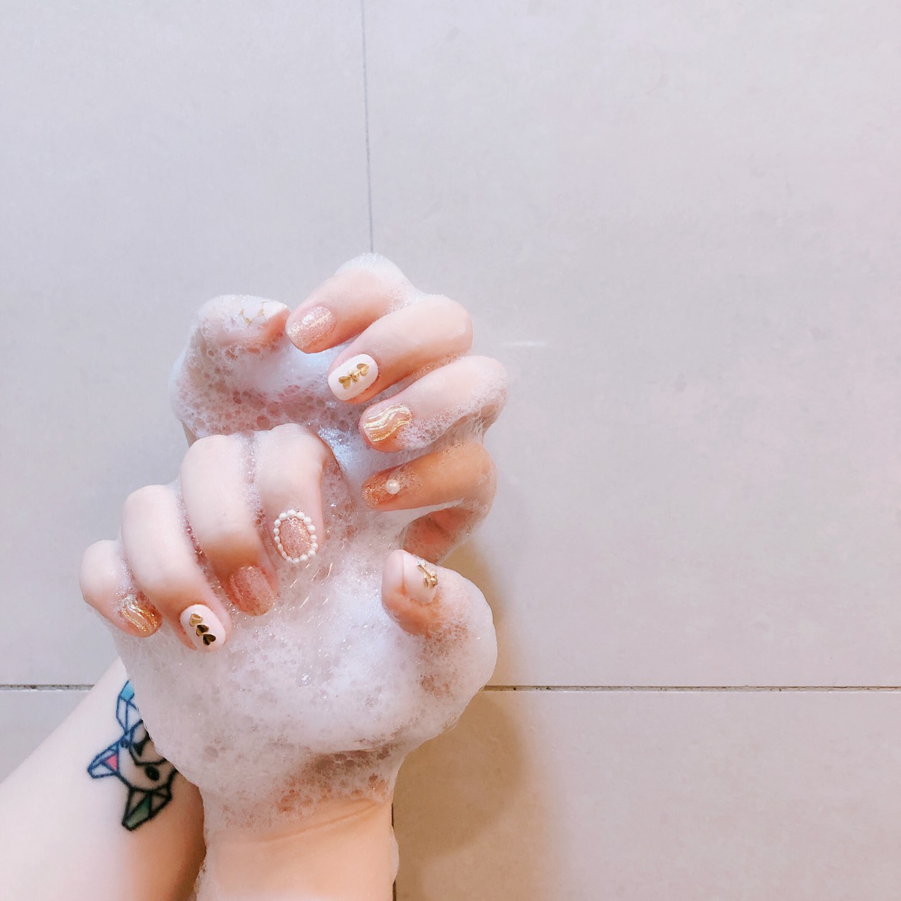▼美甲師一眼認定就是P編的指彩,整個受寵若驚,這小公主氛圍真的是P邊的最愛啦~粉紅閃粉和淡粉色調色搭配帶出夏日清新卻又不失氣質,玫瑰、愛心亮片、珍珠排列帶出公主粉嫩感,水流線條讓公主傲氣感又拉回帶出柔軟典雅感,這不給100分不行啦!